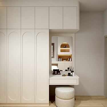 บิ้วห้องนอนเล็ก ตู้เสื้อผ้า โต๊ะเครื่องแป้งและโต๊ะอ่านหนังสือ